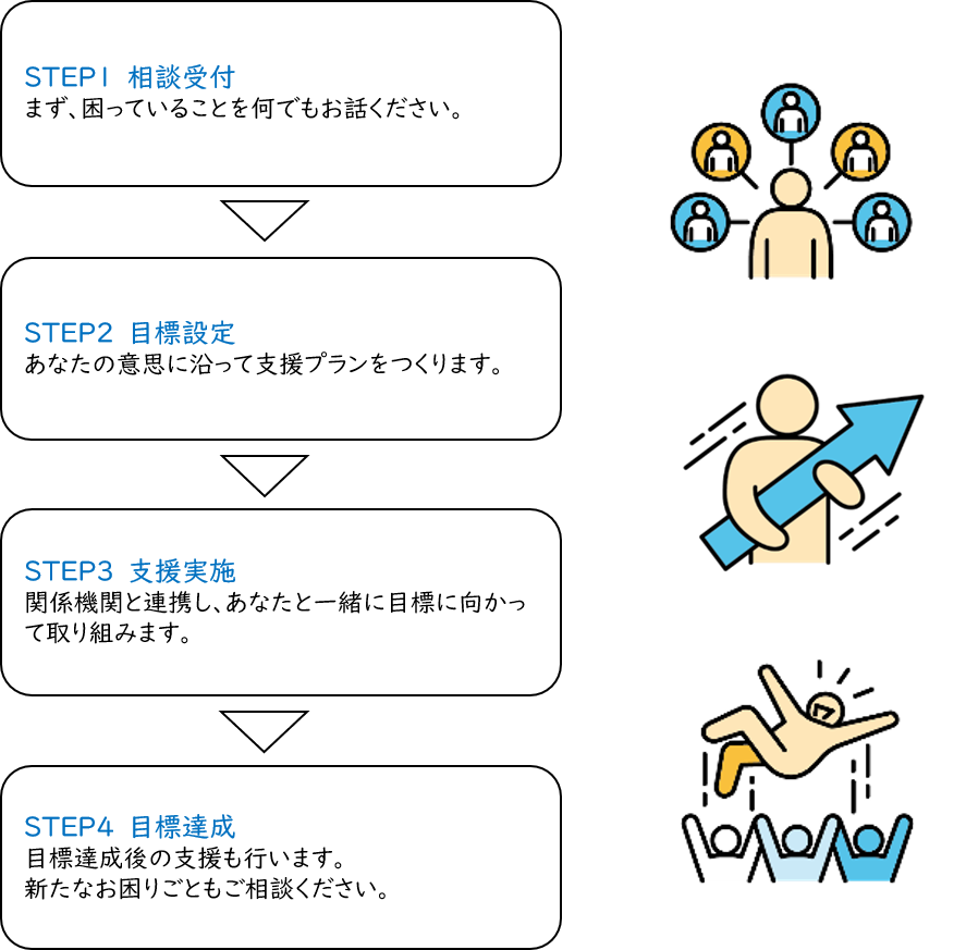 家計に問題を抱える生活困窮者からの相談に応じ、相談者と共に家計の状況を明らかにした上で必要な情報提供や専門的な助言・指導を行うことにより、相談者世帯の家計を早期に改善し、自立に向けた支援をします。